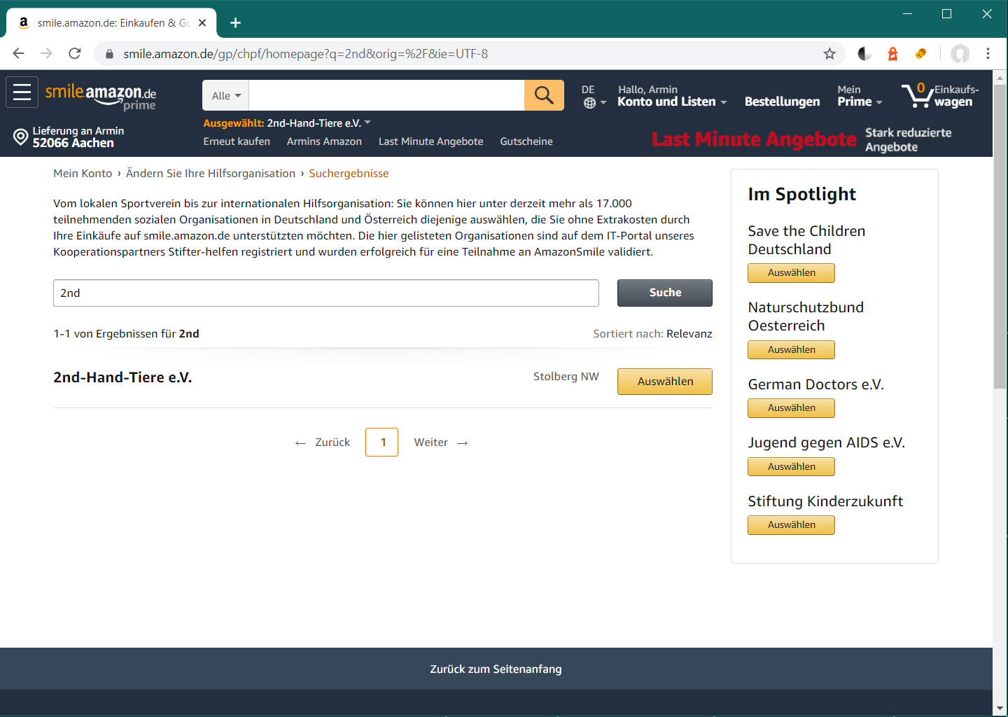 Als gemeinnützig anerkannte Organisation sind wir auch bei Amazon Smile registriert. Das Smile-Programm macht es möglich, dass ein kleiner Teil der Umsätze, die man als Käufer macht, der gemeinnützigen Organisation zukommt, die man vorher ausgewählt hat. Also quasi so, als würde Amazon einen Teil des Gewinns spenden, ohne dass es den Kunden mehr kostet.